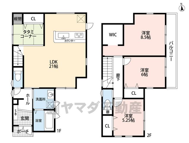 LDK21畳(1F)、洋8.5畳(2F)、洋6畳(2F)、洋5.2畳(2F) |