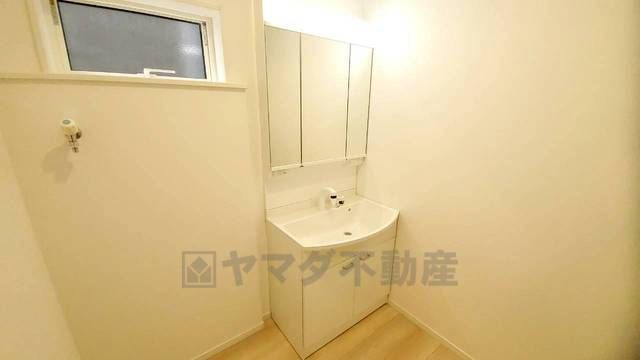 三面鏡つき洗面台。収納も一体型になっているので、ドライヤーやヘアアイロンの置き場に困りません。