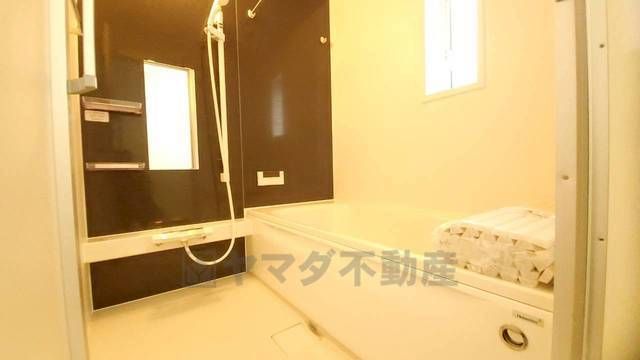 1日の疲れを癒すくつろぎのバスルーム。足を伸ばしてもゆったりと入れるサイズです。お子様と一緒にお風呂に入っても狭くないですね^^