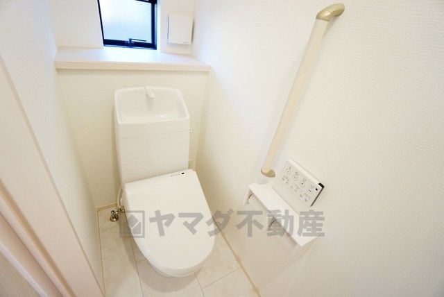 温水洗浄機付トイレです。節水機能もあるので、安心して使えますね。もちろん、1階2階の2ヶ所にトイレがあるので、忙しい朝にもゆとりができますね。