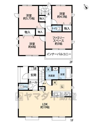 LDK19畳(1F)、洋6畳(2F)、洋5.7畳(2F)、洋4.5畳(2F)、その他5畳(2F) |