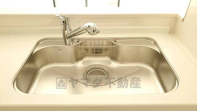 広々としたステンレスシンクには、洗剤やスポンジを収納出来るラック付き。広さも確保しているので、大きなお鍋も洗いやすいです。