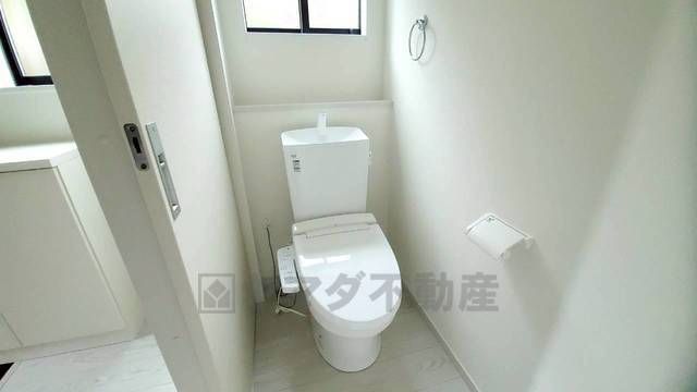 温水洗浄機付トイレです。節水機能もあるので、安心して使えますね。もちろん、1階2階の2ヶ所にトイレがあるので、忙しい朝にもゆとりができますね。