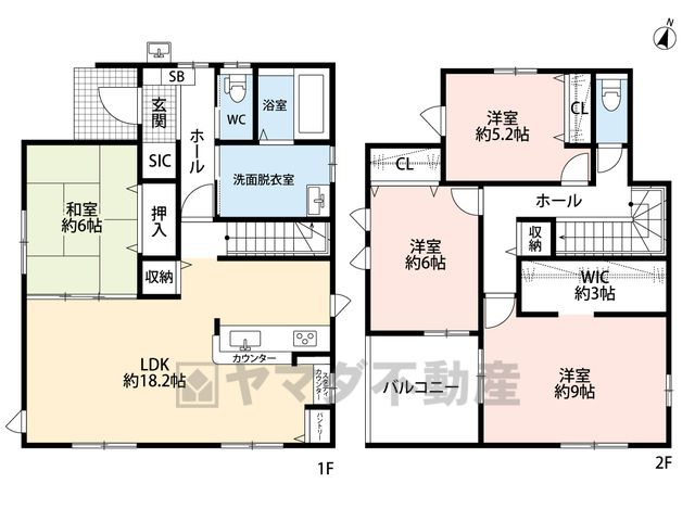 LDK18.2畳(1F)、和6畳(1F)、洋9畳(2F)、洋6畳(2F)、洋5.2畳(2F) |