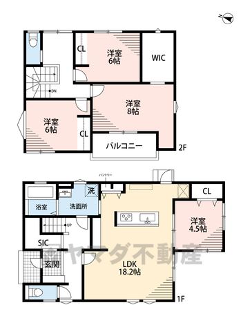 LDK18.2畳(1F)、洋4.5畳(1F)、洋8畳(2F)、洋6畳(2F) |