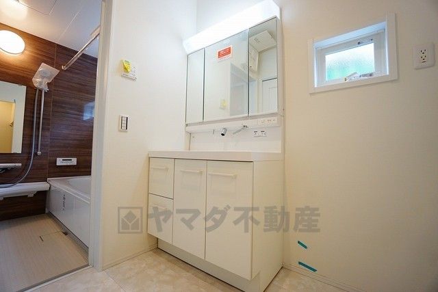 同仕様写真。三面鏡つき洗面台。鏡裏にたっぷりとした収納スペースがあります。鏡を閉めてしまえば小物は見えないため、スッキリとした印象の洗面台にできます。