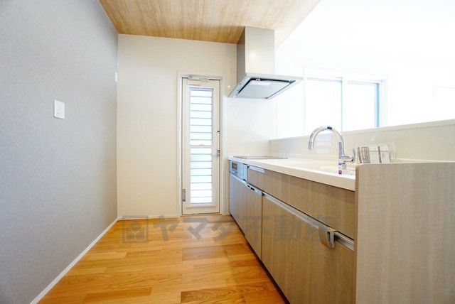 家族とコミュニケーションを取りやすい対面式キッチン。勝手口からは光が差し込み、換気もしやすく便利。