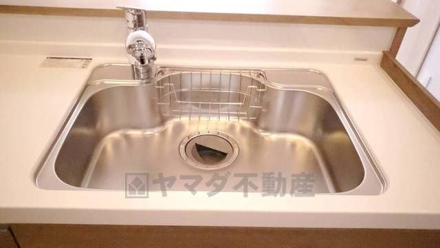 広々としたステンレスシンクには、洗剤やスポンジを収納出来るラック付き。広さも確保しているので、大きなお鍋も洗いやすいです。