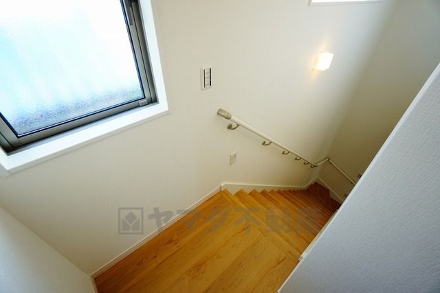 同仕様写真。小さなお子様やご高齢の方でも安心できる、手すり付き階段。段差も低めで設定されており、安全性にも優れています。