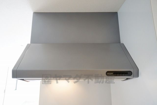 同仕様写真。風量が弱・強と切替え可能なレンジフードが調理中の煙をしっかり吸い込みます。手元を照らすライト付きです。