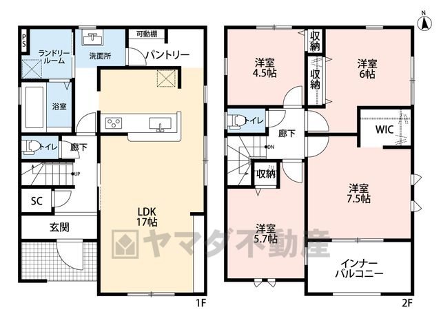 LDK17畳(1F)、洋4.5畳(2F)、洋5.7畳(2F)、洋6畳(2F)、洋7.5畳(2F) |