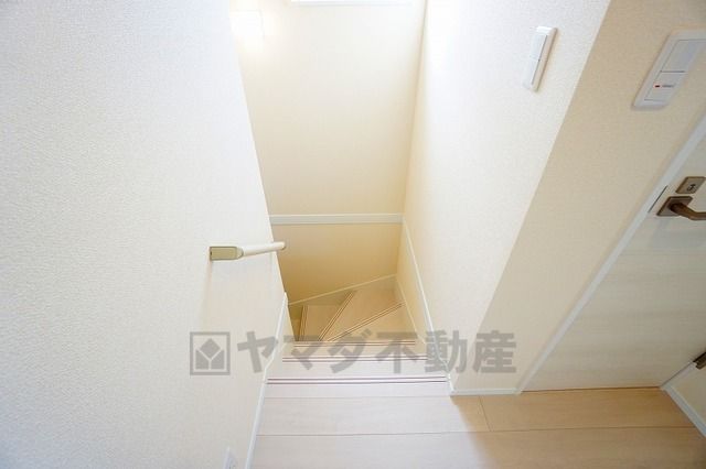 小さなお子様やご高齢の方でも安心できる、手すり付き階段。段差も低めで設定されており、安全性にも優れています。