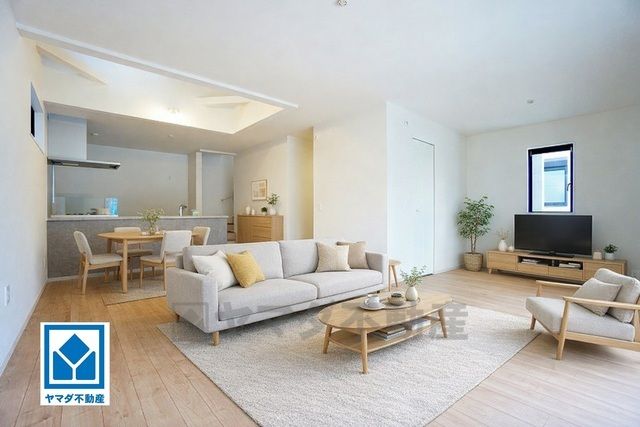 家具はイメージです。リビングは広々とした設計で、家族が集い、寛ぐ暮らしの空間を演出しています。思い思いの時間を過ごしたり、家族みんなで食事をしたり、素敵な団らんの場になりますね。