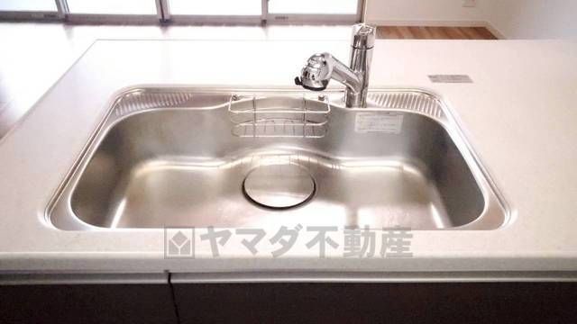 広々としたステンレスシンクには、洗剤やスポンジを収納出来るラック付き。広さも確保しているので、大きなお鍋も洗いやすいです。