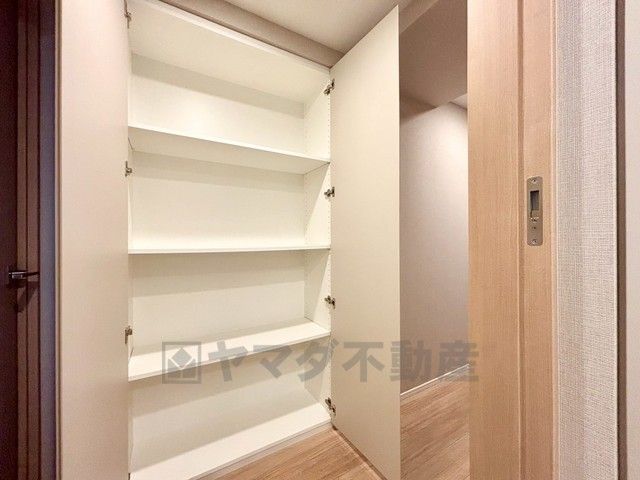 廊下には棚付きの収納スペースを確保^^