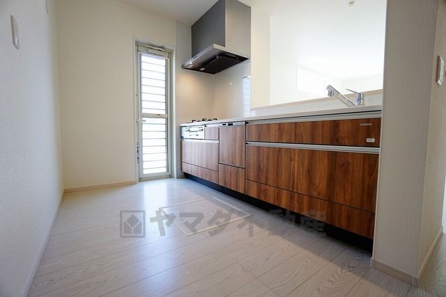 同仕様写真。勝手口付きキッチン。においがこもりやすいキッチンの換気にも役立ちます。ごみの仮置きにもなり、便利です^^