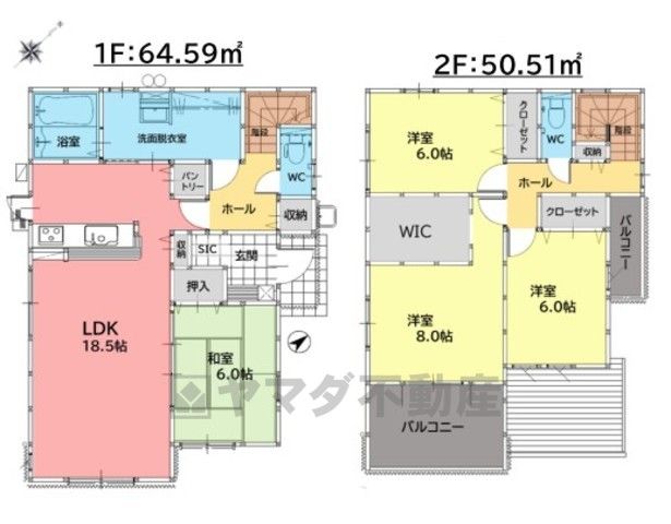 LDK18.5畳(1F)、和6畳(1F)、洋6畳(2F)、洋8畳(2F) |