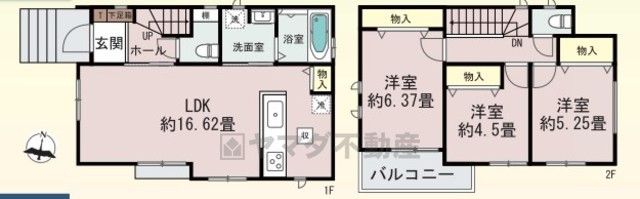 LDK16.6畳(1F)、洋4.5畳(2F)、洋5.2畳(2F)、洋6.3畳(2F) |