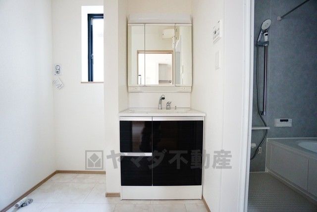 三面鏡つき洗面台。鏡裏にたっぷりとした収納スペースがあります。鏡を閉めてしまえば小物は見えないため、スッキリとした印象の洗面台にできます。