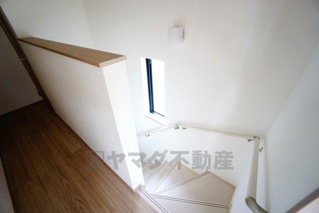 小さなお子様やご高齢の方でも安心できる、手すり付き階段。段差も低めで設定されており、安全性にも優れています。