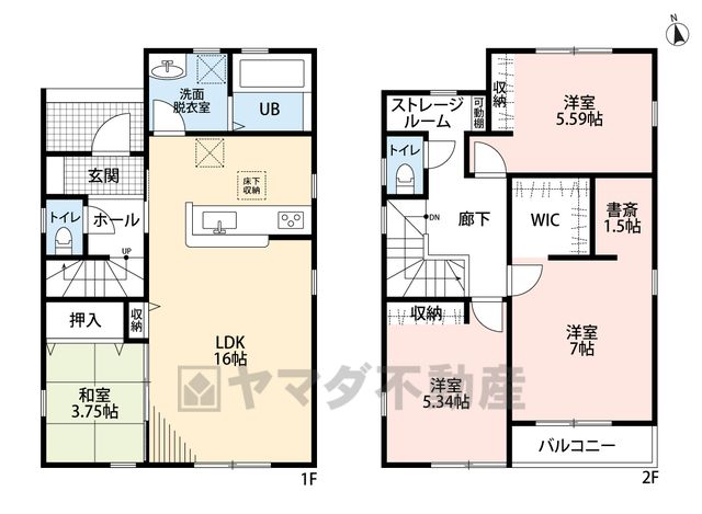 LDK16畳(1F)、和3.7畳(1F)、洋5.3畳(2F)、洋5.5畳(2F)、洋7畳(2F) |