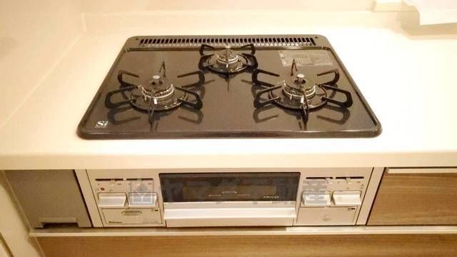3種類の料理が同時に調理できる、3口ガスコンロ。忙しい夕食の支度時間が短縮できて嬉しいですね。