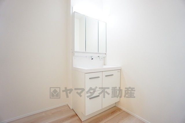 三面鏡つき洗面台。鏡裏にたっぷりとした収納スペースがあります。鏡を閉めてしまえば小物は見えないため、スッキリとした印象の洗面台にできます。
