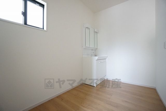 同仕様写真。三面鏡つき洗面台。鏡裏にたっぷりとした収納スペースがあります。鏡を閉めてしまえば小物は見えないため、スッキリとした印象の洗面台にできます。