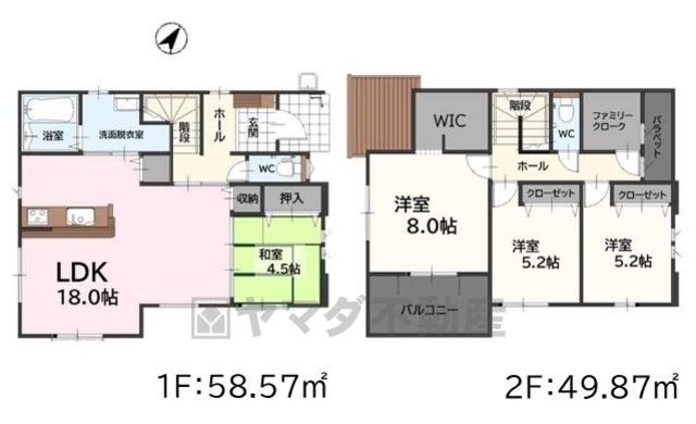 LDK18畳(1F)、和4.5畳(1F)、洋5.2畳(2F)、洋8畳(2F) |