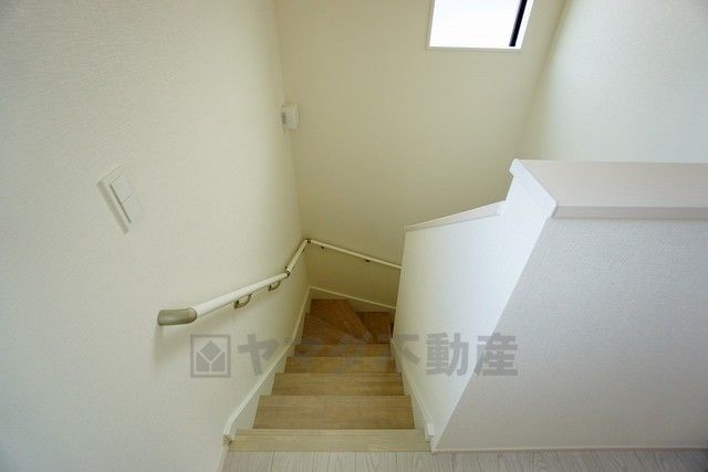 同仕様写真。小さなお子様やご高齢の方でも安心できる、手すり付き階段。段差も低めで設定されており、安全性にも優れています。
