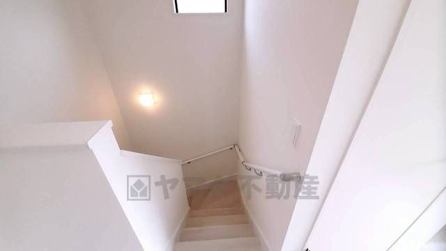 小さなお子様やご高齢の方でも安心できる、手すり付き階段。段差も低めで設定されており、安全性にも優れています。