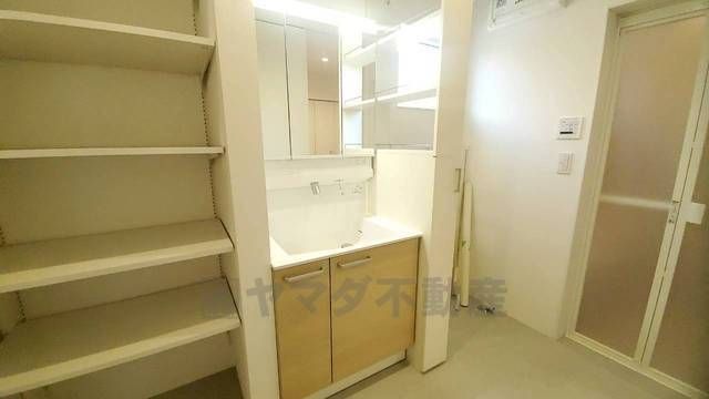 三面鏡つき洗面台。鏡裏にたっぷりとした収納スペースがあります。鏡を閉めてしまえば小物は見えないため、スッキリとした印象の洗面台にできます。