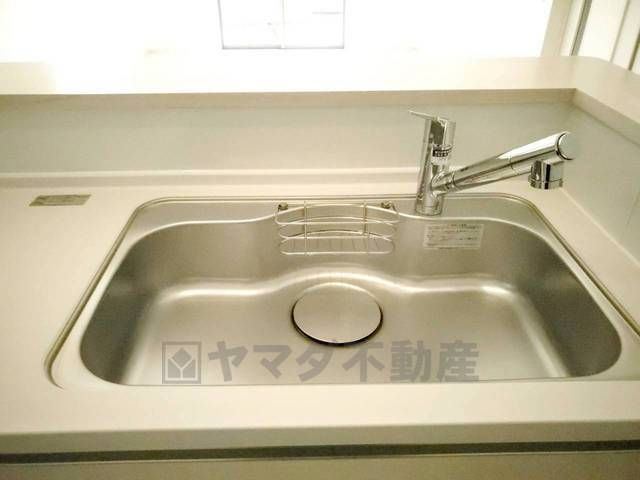 広々としたステンレスシンクには、洗剤やスポンジを収納出来るラック付き。広さも確保しているので、大きなお鍋も洗いやすいです。