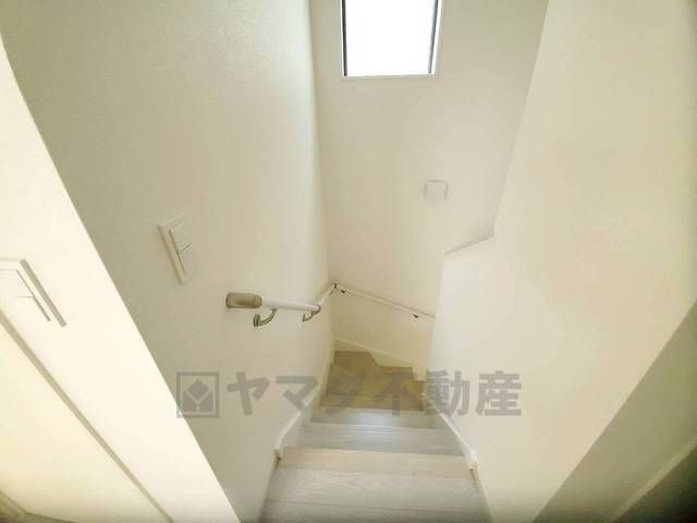 小さなお子様やご高齢の方でも安心できる、手すり付き階段。段差も低めで設定されており、安全性にも優れています。