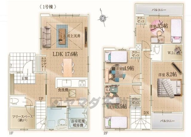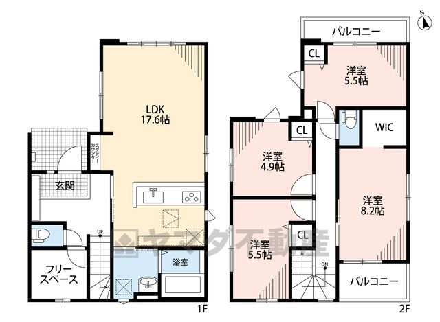 LDK17.6畳(1F)、洋4.9畳(1F)、洋5.5畳(2F)、洋8.2畳(2F) |