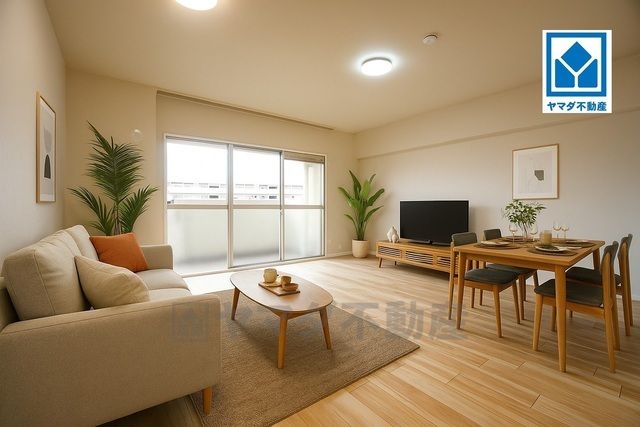 家具はイメージです。大きな窓のあるリビングは、陽光あふれる明るい空間です。居心地良く、ご家族皆がゆったり寛げる憩いの空間となりそうです。
