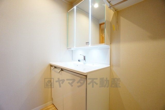 三面鏡つき洗面台。鏡裏にたっぷりとした収納スペースがあります。鏡を閉めてしまえば小物は見えないため、スッキリとした印象の洗面台にできます。