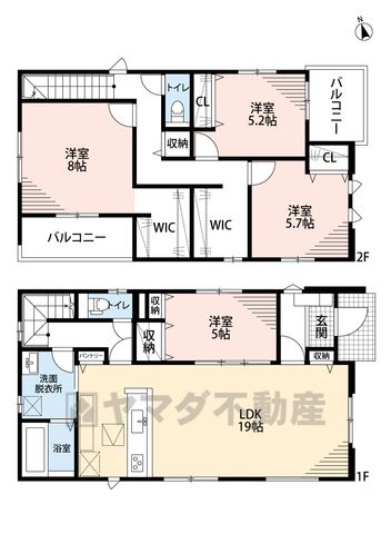 LDK19畳(1F)、洋5畳(1F)、洋5.2畳(2F)、洋5.7畳(2F)、洋8畳(2F) |