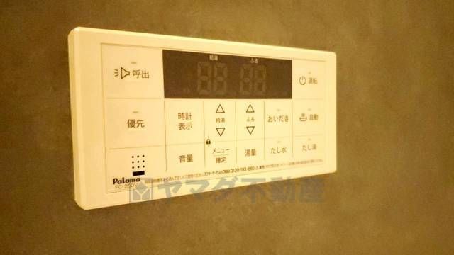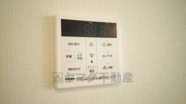 キッチン横からお湯張り、追い炊き、足し湯がボタン一つで楽々操作できる給湯機リモコンです。忙しい夕飯準備の時間帯に重宝しますね。