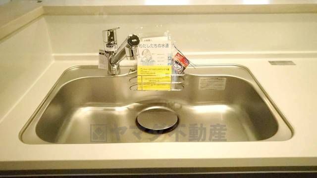 広々としたステンレスシンクには、洗剤やスポンジを収納出来るラック付き。広さも確保しているので、大きなお鍋も洗いやすいです。