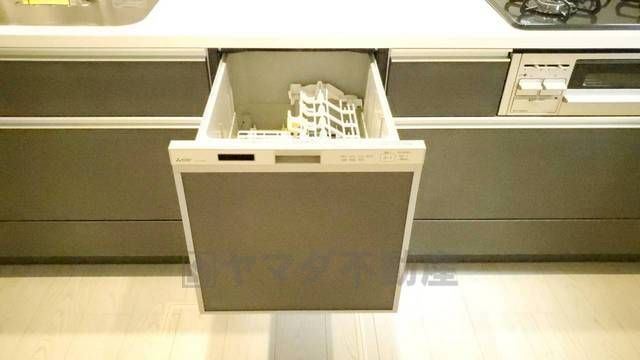 食事の後の手間を解消する食器洗い乾燥機付。冬場の洗い物で手荒れの悩みもなくなります。手洗いよりも節約できて便利。キッチンにある床下収納は、居住スペースを減らさずに買い置きの調味料や非常食などを保管する