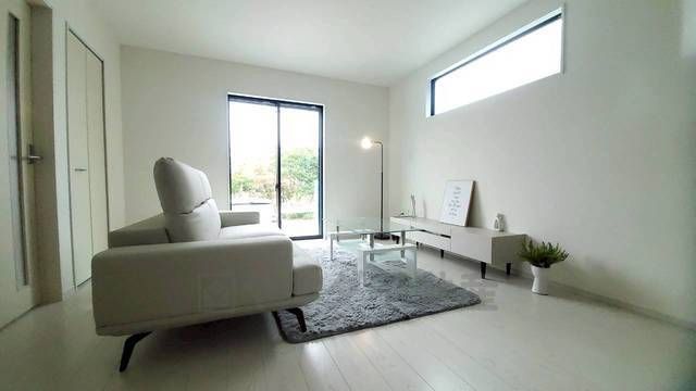 大きな窓のあるリビングは、陽光あふれる明るい空間です。居心地良く、ご家族皆がゆったり寛げる憩いの空間となりそうです。