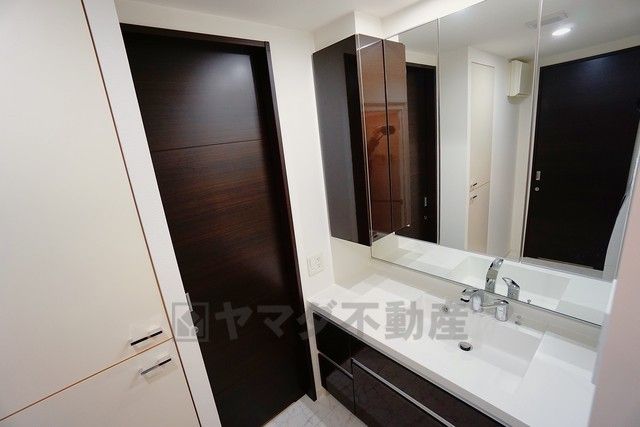 横長の鏡が、空間に奥行をもたらし、広々としたバスルームを印象付けています。浴室乾燥機付きで換気・雨の日の洗濯もばっちり^^