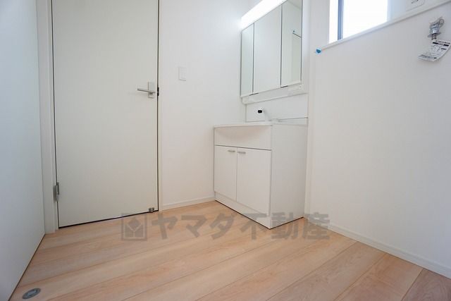 同仕様写真。三面鏡つき洗面台。収納も一体型になっているので、ドライヤーやヘアアイロンの置き場に困りません。