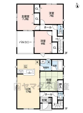 LDK17畳(1F)、和6畳(1F)、洋6畳(2F)、洋7畳(2F)、洋7.2畳(2F) |
