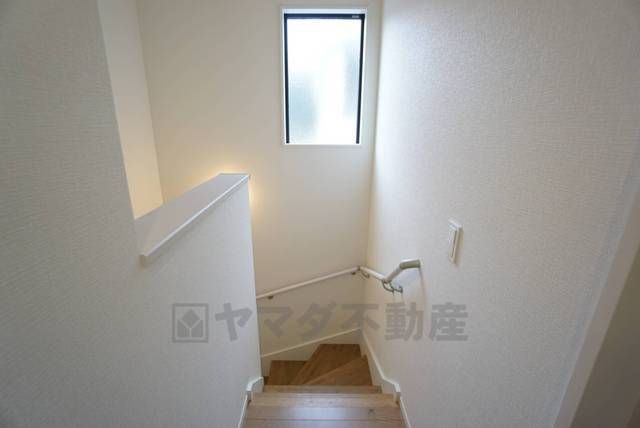小さなお子様やご高齢の方でも安心できる、手すり付き階段。段差も低めで設定されており、安全性にも優れています。