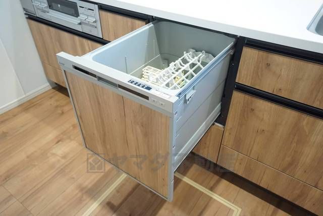 食事の後の手間を解消する食器洗い乾燥機付。冬場の洗い物で手荒れの悩みもなくなります。手洗いよりも節約できて便利。