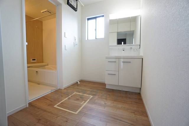 三面鏡つき洗面台。鏡裏にたっぷりとした収納スペースがあります。鏡を閉めてしまえば小物は見えないため、スッキリとした印象の洗面台にできます。