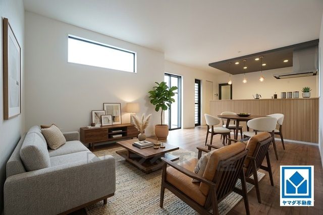 大きな窓のあるリビングは、陽光あふれる明るい空間です。居心地良く、ご家族皆がゆったり寛げる憩いの空間となりそうです。
