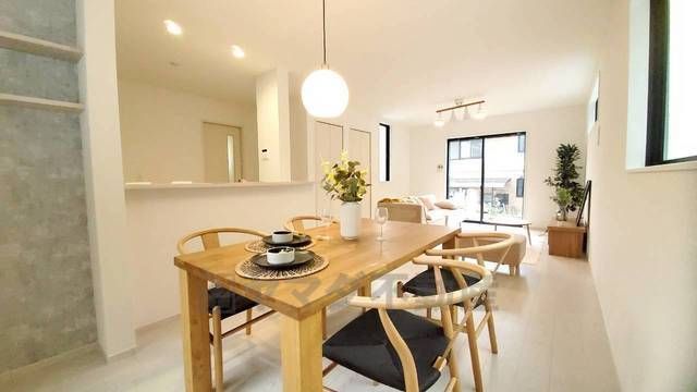 リビングは広々とした設計で、家族が集い、寛ぐ暮らしの空間を演出しています。思い思いの時間を過ごしたり、家族みんなで食事をしたり、素敵な団らんの場になりますね。
